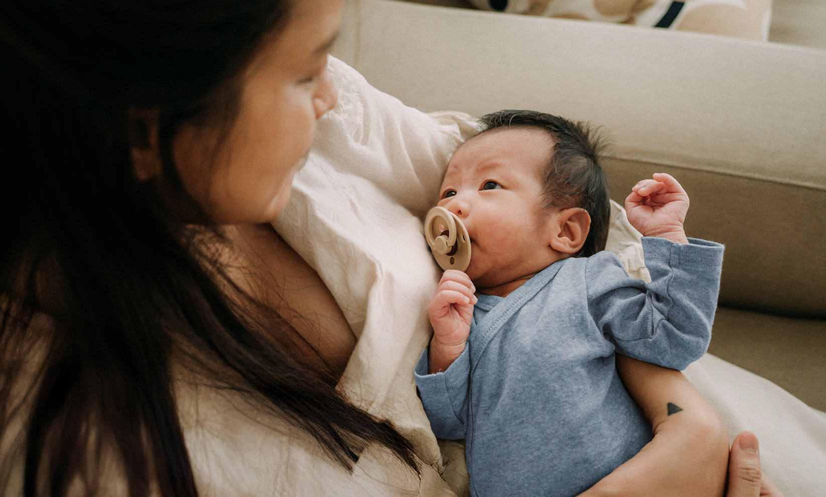 A mom smiling at her baby while carrying her